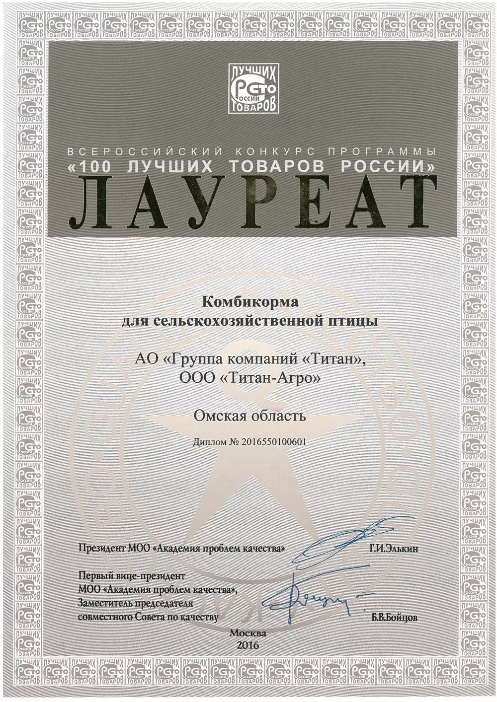 Titan-Agro products have repeatedly placed high in the All-Russian competition of the "100 Best Goods of Russia" programme.